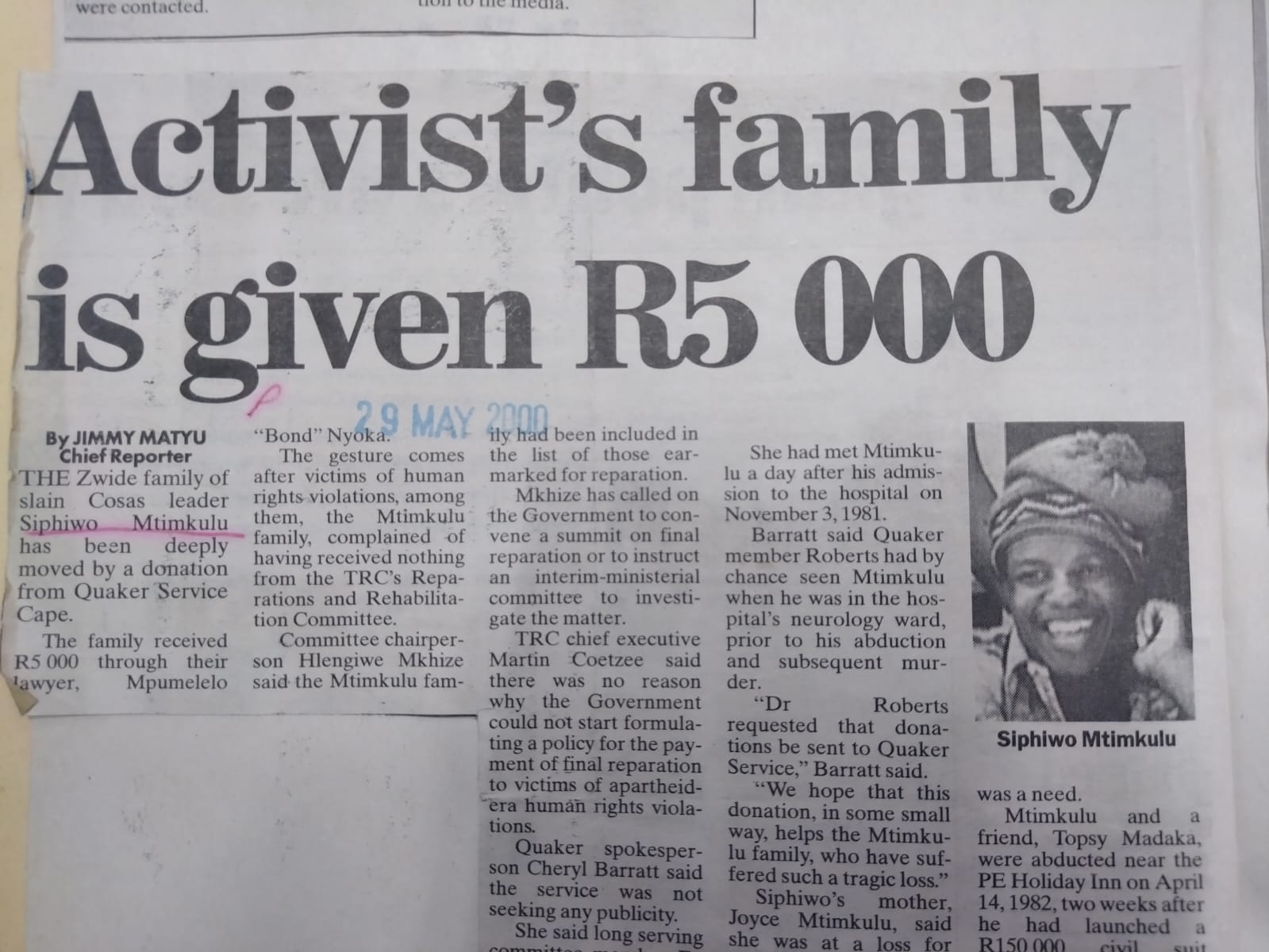 More than 19 000 victims of apartheid crimes who testified of their sufferings before the TRC were compensated with a mere once off payment of R30 000 each.